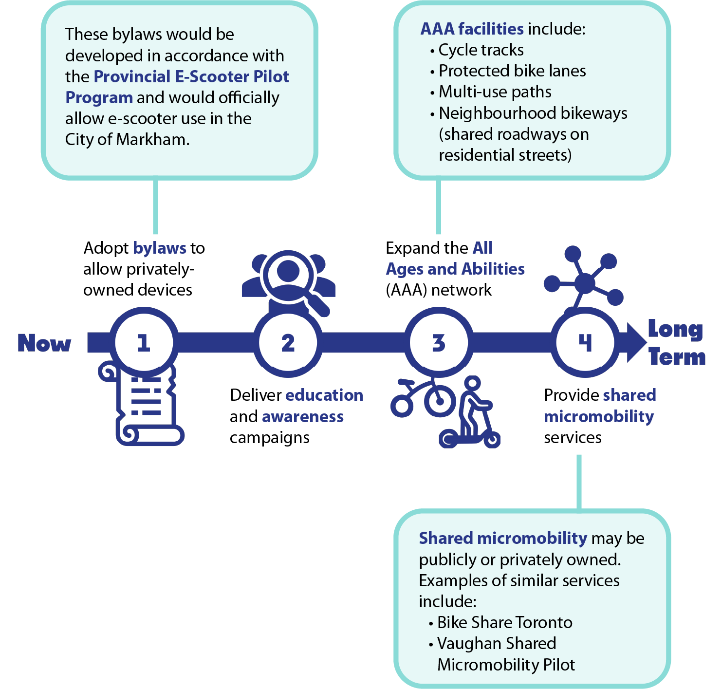 To ensure that Markham is building the right infrastructure, implementing the right policies, and launching the right programs at the right times, the Micromobility Strategy proposes a phased approach to implementing its recommendations.